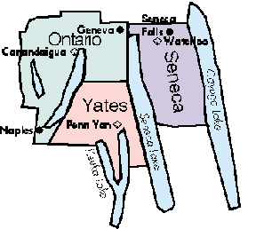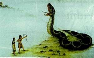 The Western Finger Lakes region is a water lover's paradise. Boating, fishing and swimming are all popular summer activities. Because of their tremendous depth, (the deepest, Seneca, is over 600 feet), the larger lakes do not freeze even in the frigid Western New York winters. The unique climate of the lake region is ideal for grape growing and wine making. The cities of Geneva and Canandaigua were important pioneer settlements in the early history of Western New York. Ontario County "the mother of counties", at one time took in most of the Genesee Country. According to Indian legend, Bare Hill at the foot of Canandaigua Lake near Naples was the birthplace of the Seneca people. The death throes of a wounded serpent (right) supposedly cleared the hill of its vegetation, and thus the name. The one-time Seneca capital, Ganondagan, near Victor in Ontario County, is now a state historic site. |